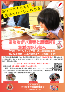 赤い羽根共同募金 「クラウドファンディング型」募金のご案内(オンライン) 小千谷市社会福祉協議会では、赤い羽根共同募金の寄付金で「みんなの食堂」を運営しています。地域に暮らす誰でも、自分のありのままでいていい場所、おいしいご飯でゆるくつながる居場所づくりを目指しています。今年度は、「みんなの食堂」に重点を置き皆さまからお寄せいただいた寄付金を活用させていただきます。温かいご協力をお待ちしております。